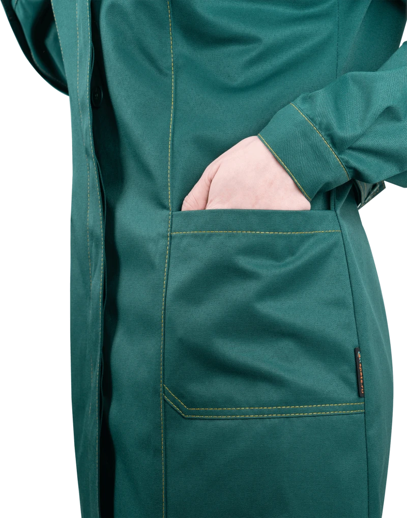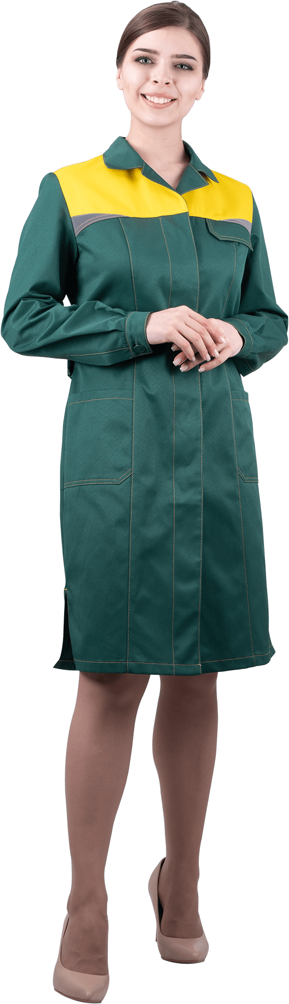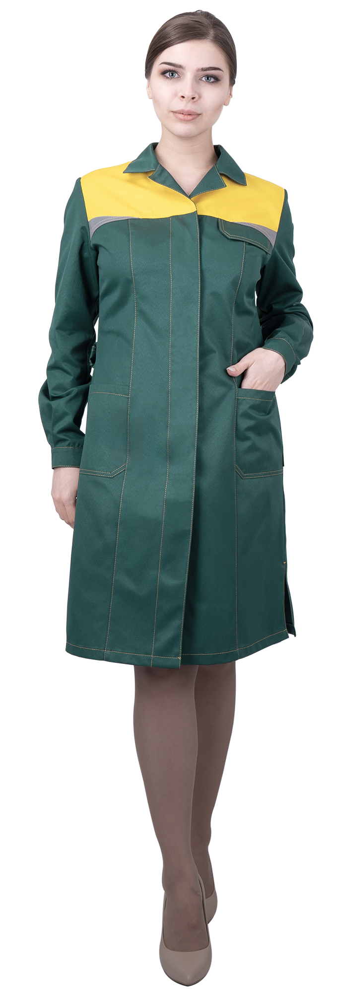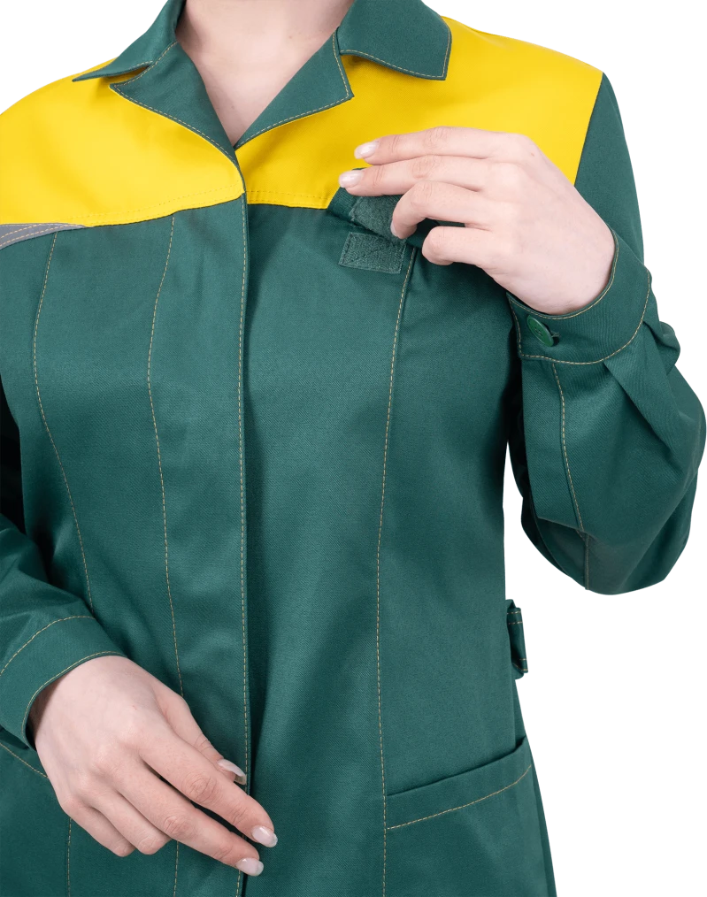 Халат женский КМ-10 ЛЮКС от механических воздействий и ОПЗ, зеленый/желтый