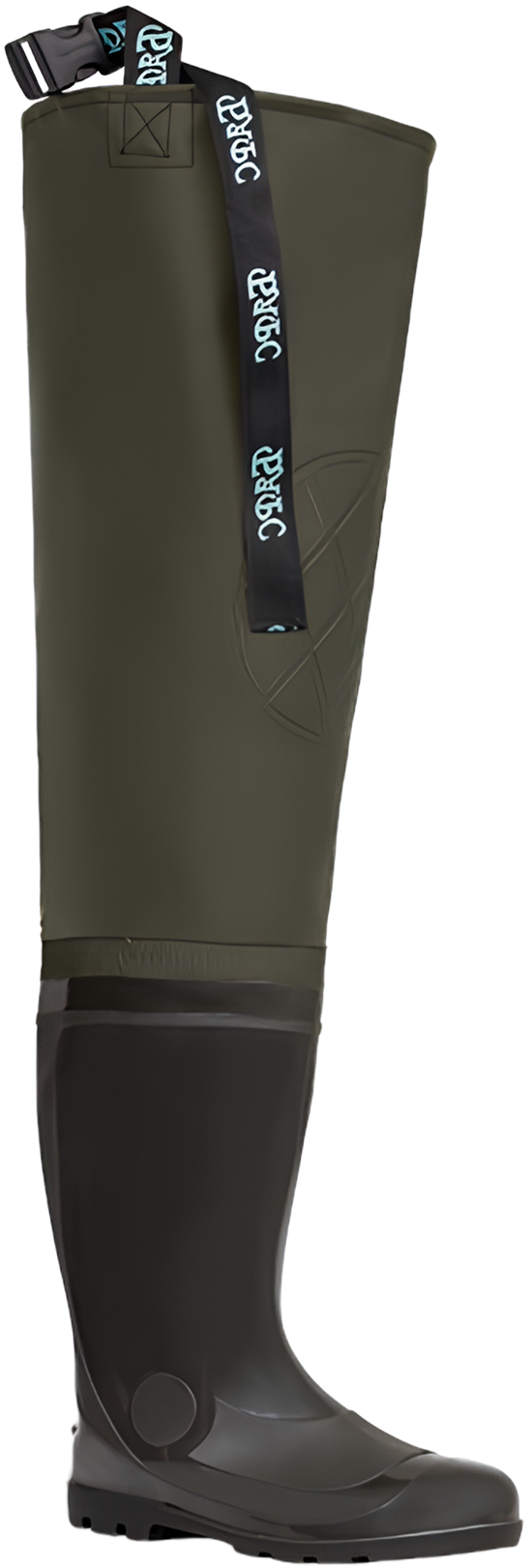 Высокие болотные сапоги выполнены на основе ПВХ и «Винитола» с усилением в области колена и ремешком для фиксации. Нижняя часть изготовлена методом двухкомпонентного литья из ПВХ (поливинилхлорид). Верхняя часть – надставка из водоотталкивающей ткани «Винитол». Область колена защищена наколенником из «Винитола» и поролона. Специальный ремешок позволяет фиксировать сапог к ремню или к одежде. Предназначены для защиты ног от воды. Сапоги имеют мягкую прокладку под подноском, профиль подошвы, препятствующий скольжению.