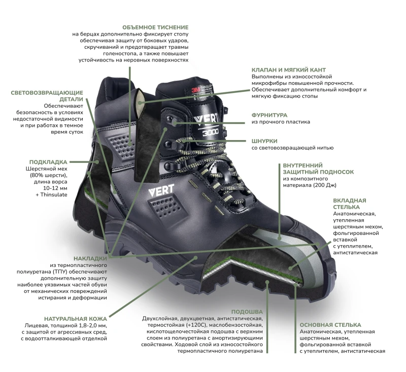 Покупайте Ботинки VERT (VERT 3015) с КП и КС Thinsulate® шерст.мех, кожаные ПУ/ТПУ по цене 6435 руб. оптом или в розницу в магазине спецодежды СнабТим. Большой выбор защитной одежды, СИЗ и других хозтоваров в Зеленодольске. Заказывайте онлайн или по телефону +7 (991) 190-59-22