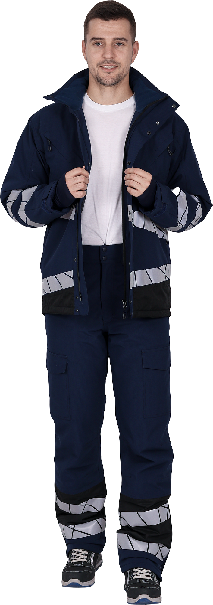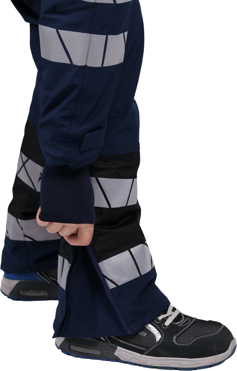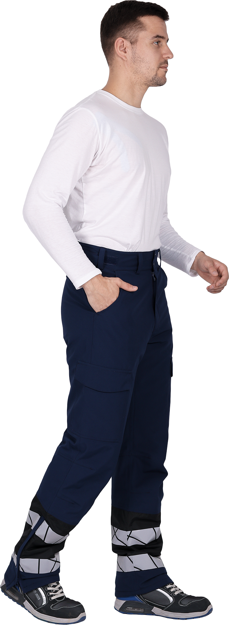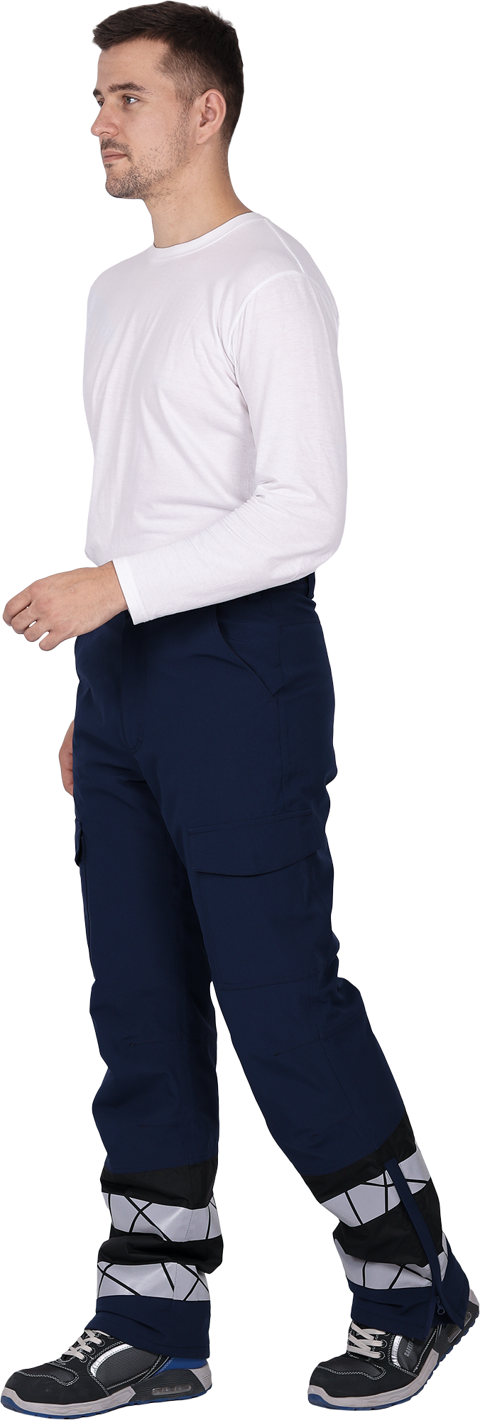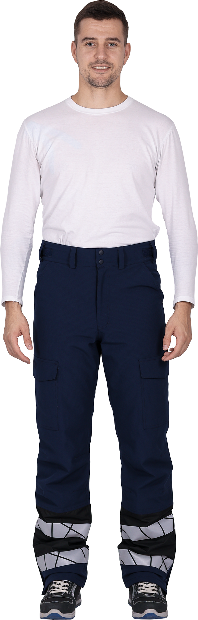 • две охватывающие термолкеевые световозвращающие полосы шириной 50 мм по низу брюк