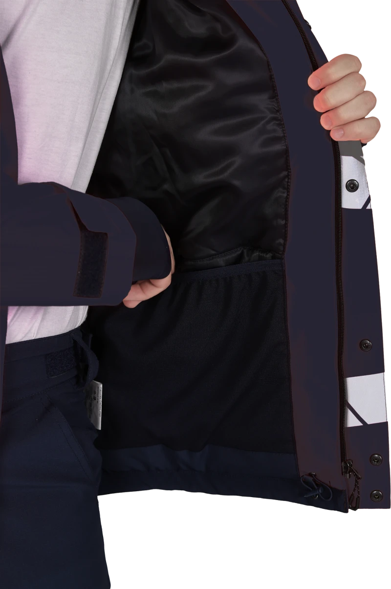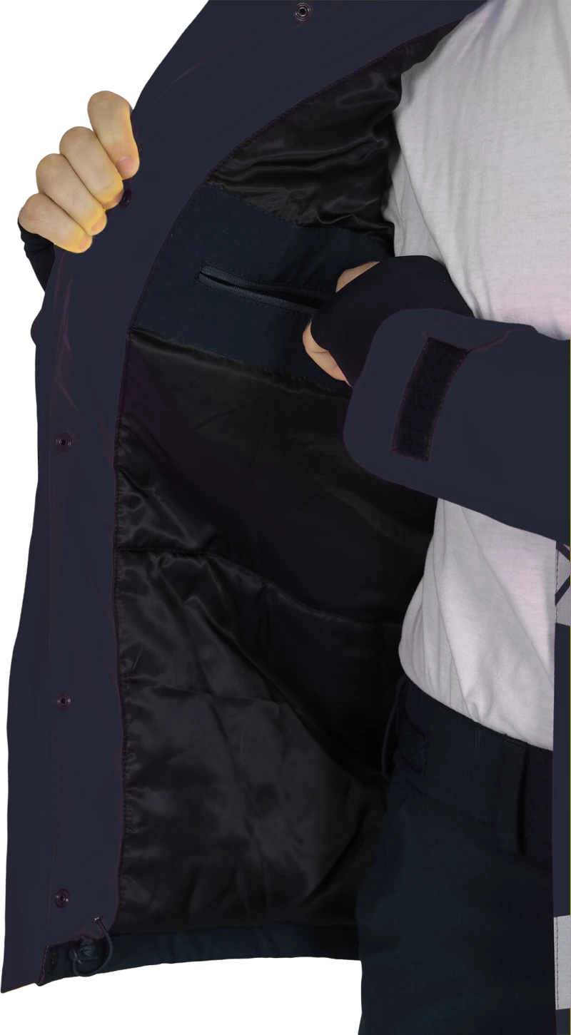 • между бортом и ветрозащитной планкой — внутренний карман на молнии под документы формата А4