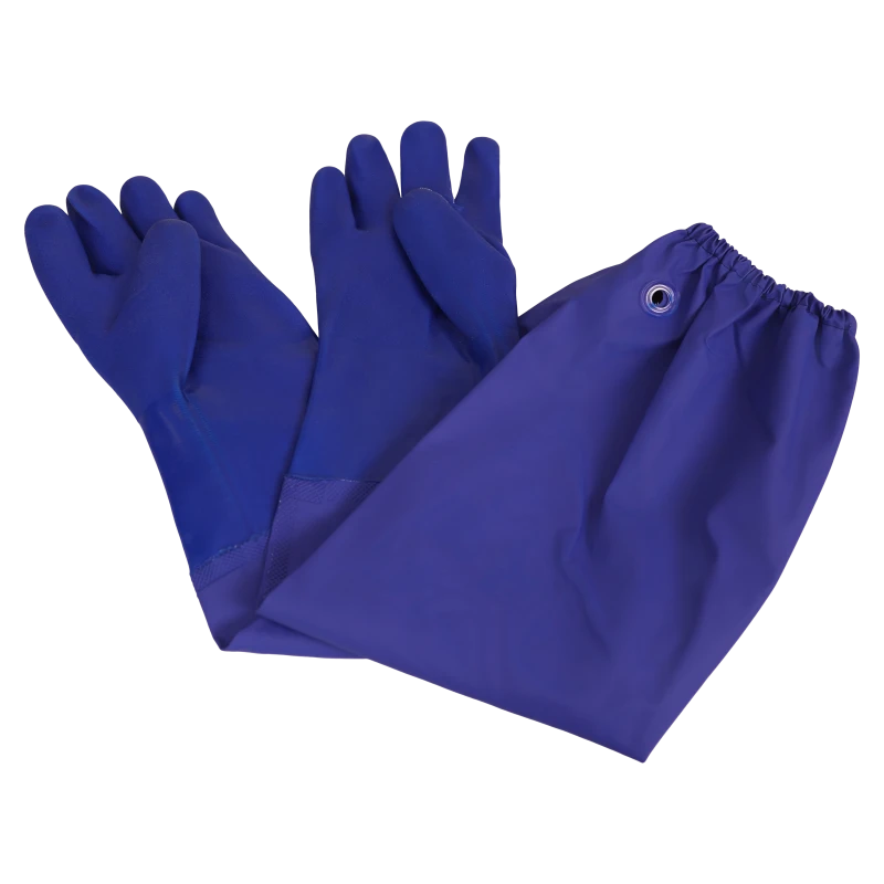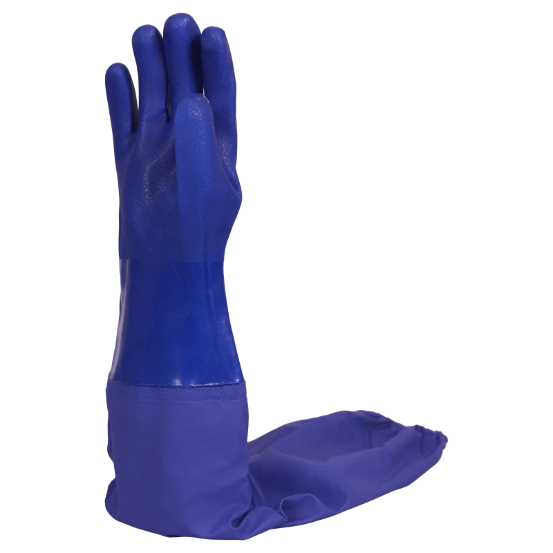 Перчатки из хлопчатобумажного трикотажа с припаянным нарукавником из модифицированного поливинилхлорида для защиты от механических воздействий, нефти, нефтепродуктов, минеральных масел, кислот и щелочей.