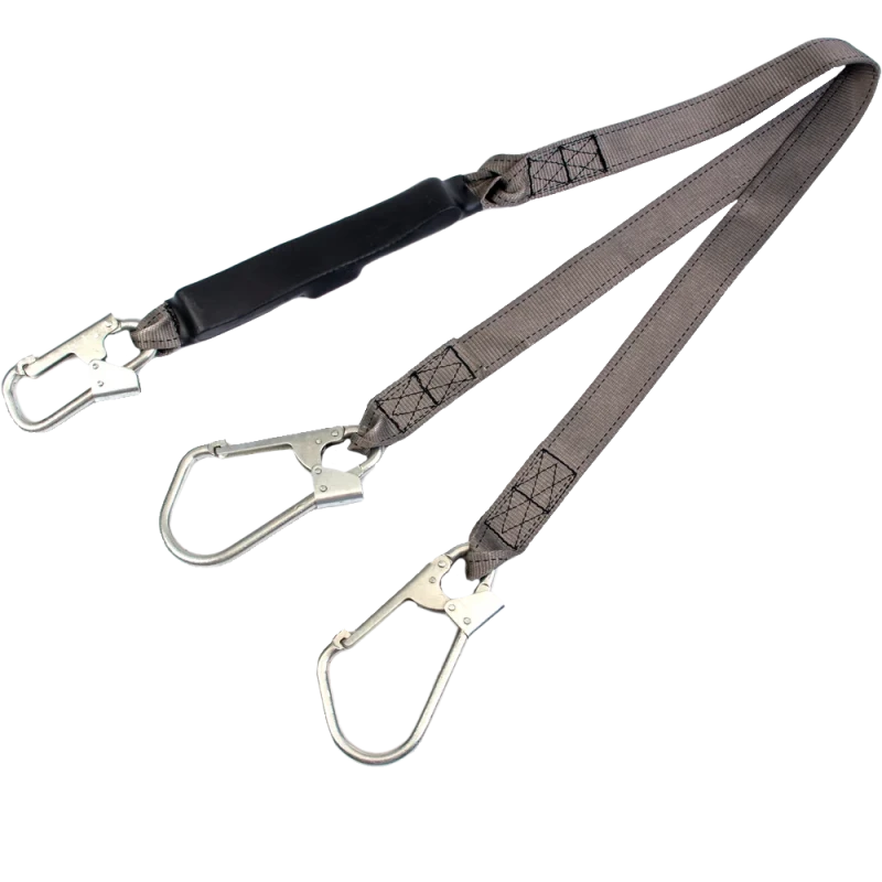 • Строп ленточный двухветвевой комбинации с амортизатором и тремя карабинами (зёв 25 мм и 50 мм) используется как средство индивидуальной защиты от падения с высоты, может применяться как отдельная соединительная деталь, узел или компонент в системе с привязями и с анкерной точкой.
